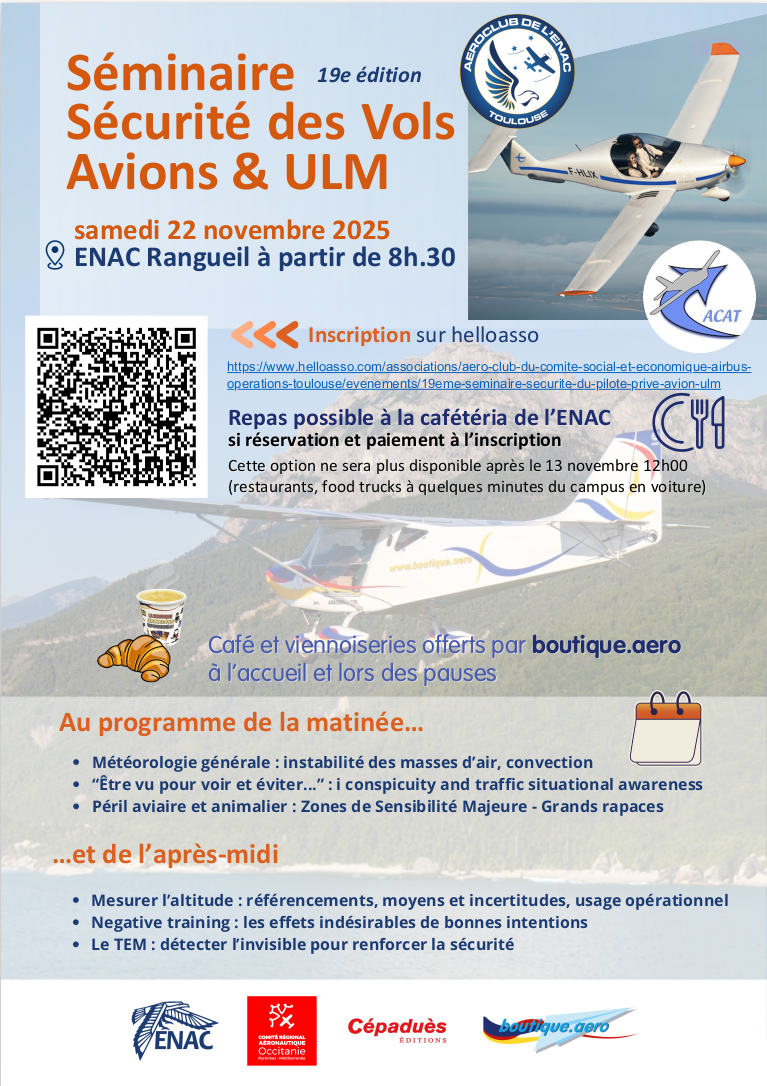 Depuis 2015, il est co-organisé avec l'aéroclub de l'ENAC, sous le patronnage de l'AUATBL [Association des Usagers de l'Aérodrome de Toulouse-Balma-Lasbordes (LFCL)], soutenu par la DSAC-Sud et la Direction de l'ENAC qui met à disposition le grand amphithéâtre de l'école et sa cafétaria à l'ENAC (site de Rangueil à Toulouse).